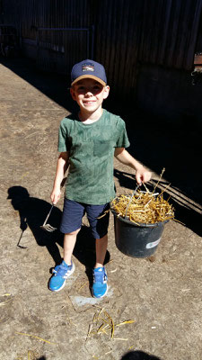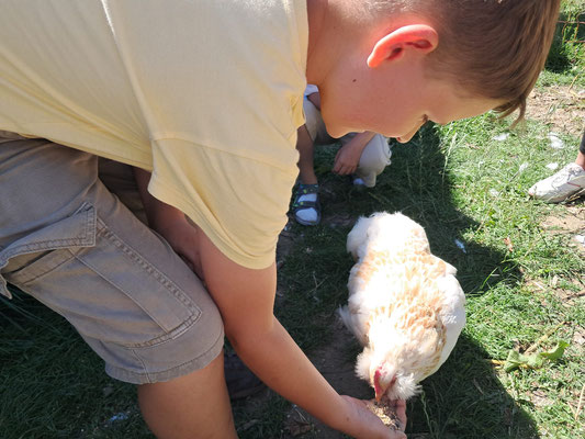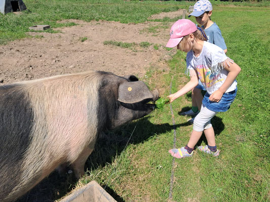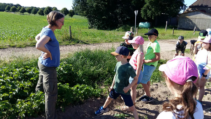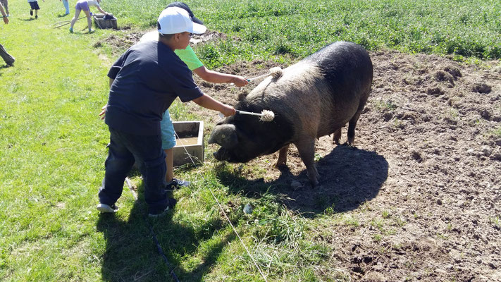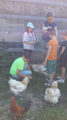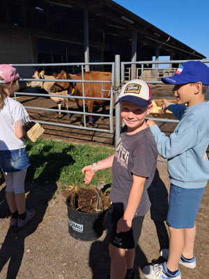 Dort angekommen wurden wir von Micha und Mirja herzlich begrüßt. In einem großen Sack versteckten sich viele Hinweise darauf, was man auf diesem großen Bauernhof alles sehen und erleben kann. Und dann ging es los! Die Kälber mussten gefüttert werden und wir mussten erst einmal herausfinden, was den süßen Kälbchen, die alle einen Namen mit dem Anfangsbuchstaben E trugen, am besten schmeckt. Ist es die Silage, schönes frisches Gras oder leckerer Klee und andere Wildblumen? Die Antwort erhielten wir prompt und nun mussten wir tüchtig Mist einsammeln und in Eimern aufs Feld bringen, damit das frische Grün, dort weiter so gut wachsen kann und richtig saftig wird. Auf dem Kartoffelfeld ging es dem Kartoffelkäfer an den Kragen, der die Blätter der Pflanze gerne frisst. Wir sammelten einige ein, fanden sie aber so hübsch und hatten großes Mitleid mit ihnen, so dass wir sie nicht zu den Hühnern brachten, sondern sie weit weg von den Kartoffeln wieder in die Freiheit entließen. Dann ging es weiter zu den Schweinen, die sich sehr über unseren Besuch freuten. Wir stellten Schweineüberraschungseier aus großen Brotwürfeln her, die die drei Sauen und ein Eber mit großer Sorgfalt auspackten. Dann füllten wir ihnen ihre Matschgruben mit neuem Wasser, worüber sich die vier Tiere unglaublich freuten. Auch wir selbst bekamen an diesem heißen Sommertag noch eine kühle Erfrischung unterm Wasserschlauch. Zum Abschluss lernten wir dann noch verschiedene Getreidearten kennen und probierten im Hühnerstall aus, welche Sorten den Hühnern am besten schmecken. Auch streicheln durften wir diese zum Abschied.