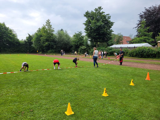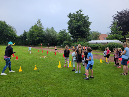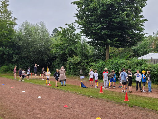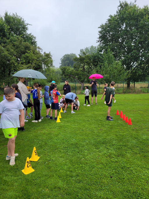 Seit einigen Wochen hatten sich die Schülerinnen und Schüler auf den heutigen Tag vorbereitet. Werfen, springen, sprinten und ausdauernd laufen. Und heute war es endlich soweit! Da wurde gezeigt, was so fleißig geübt wurde! Dank eines großartigen Engagements der Eltern und der Hausmeister, wurde schon ab 7:00 Uhr aufgebaut und die Stationen für die Kinder vorbereitet. Um 8:00 Uhr fiel der Startschuss! Ab jetzt hieß es: gemeinsam anfeuern, sein Bestes geben und den sportlichen Wettbewerb mit viel Freude genießen. Besonders der gemeinsame Ausdauerlauf der 1. und 2. Klassen zeigte, wie mitfühlend sich die Schülerinnen und Schüler gegenseitig unterstützten und Mut machten, denn alle Kinder absolvierten den Lauf erfolgreich! Auch die 3. und 4. Klassen zeigten in allen Disziplinen ihr Können und so mancher Ball flog weiter als gedacht. Das Wetter war uns auch hold. Und ein kleiner Regenschauer sorgte eher für eine willkommene Erfrischung. Da rückten die Kinder und begleitenden Lehrkräfte unter den Schirmen zusammen. Am Ende der Veranstaltung waren es wieder die tatkräftigen Eltern, die zusammen mit den Kollegen einen schnellen Abbau ermöglichten. An dieser Stelle einen ganz besonderen Dank auch an den Förderverein, der uns Mineralwasser zur Verfügung gestellt hat und uns mit Frau Stevens und Frau Mohr den ganzen Vormittag unterstützt hat. So zeigte sich wieder einmal, dass wir an der Richard-Vosgerau Schule als Team von Lehrern, Eltern und Kindern eine ganze Menge auf die Beine stellen können und es allen viel Freude bereitet hat.
